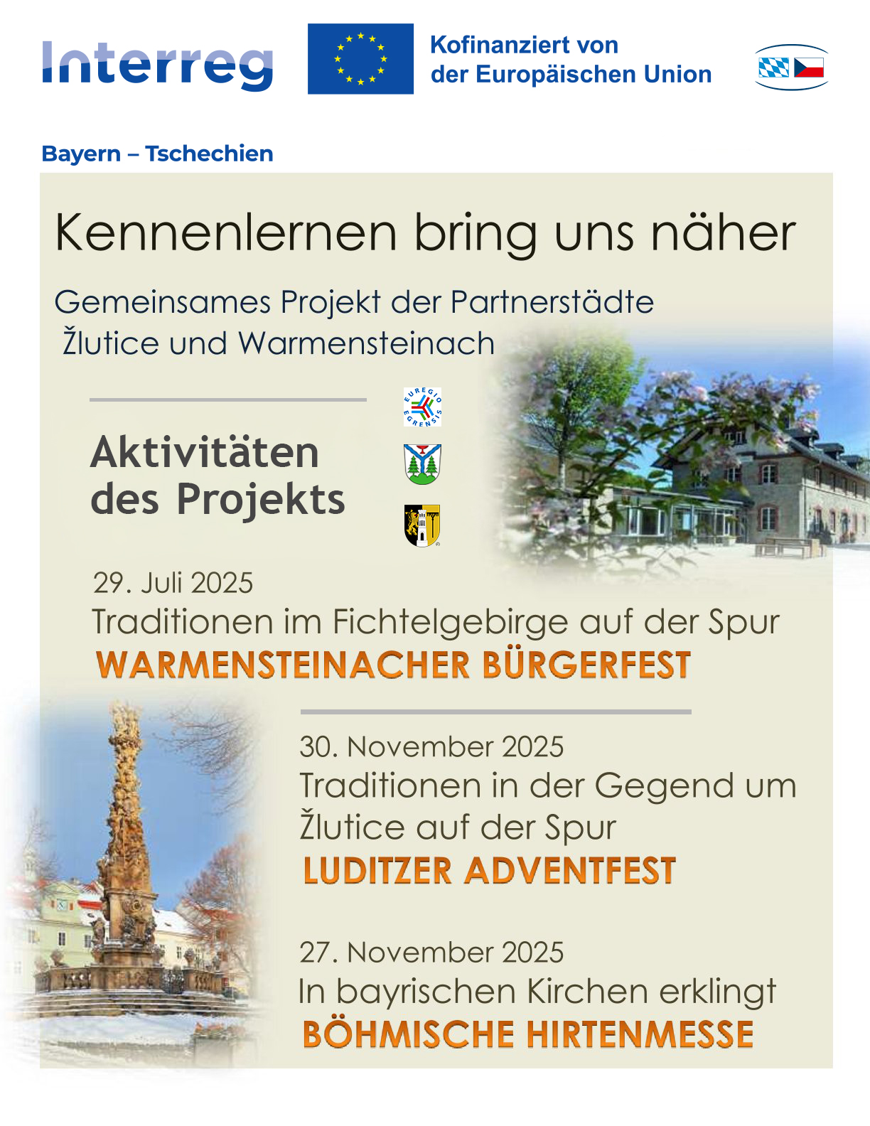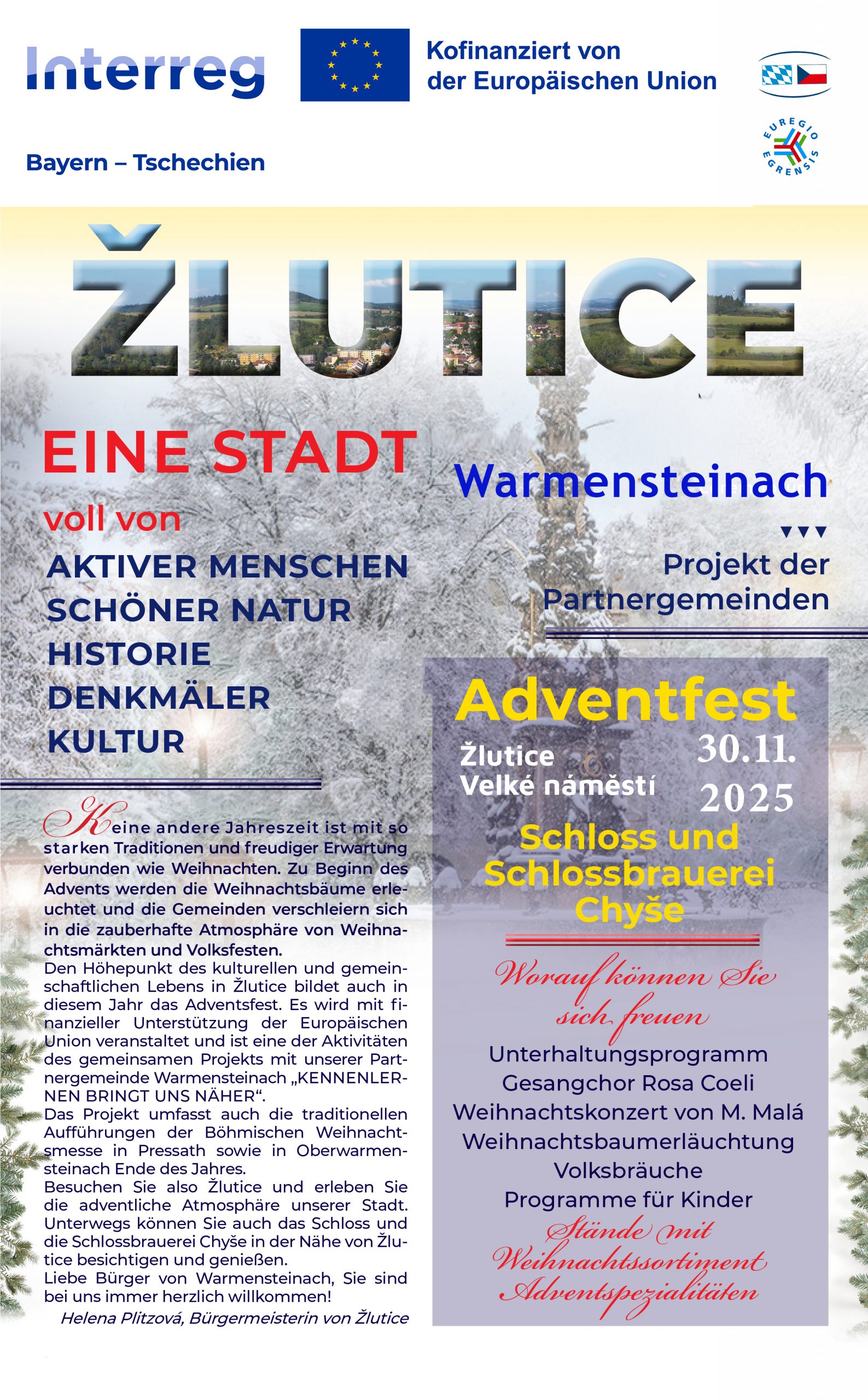 In diesem Jahr trafen sich die Bürger beider Städte zum ersten Mal auf diese Weise während der Ostermesse in Žlutice, was so inspirierend war, dass die Bürgermeister beider Städte beschlossen, an einem Veranstaltungsprogramm rund um den Advent und Weihnachten zusammenzuarbeiten. Und so entstand das Projekt „Kultur verbindet uns“, das aus Mitteln der Europäischen Union mitfinanziert wird. Im Rahmen des Projekts beschloss die Stadt Žlutice, die zwölfjährige Geschichte der Partnerschaft zwischen beiden Städten zu dokumentieren und eröffnete eine Ausstellung, die nicht nur Warmensteinach selbst mit seinen Attraktionen und Tipps zu touristischen, Sport- und Kulturaktivitäten vorstellt, sondern auch die gemeinsamen Aktivitäten der beiden Partnerstädte dokumentiert.