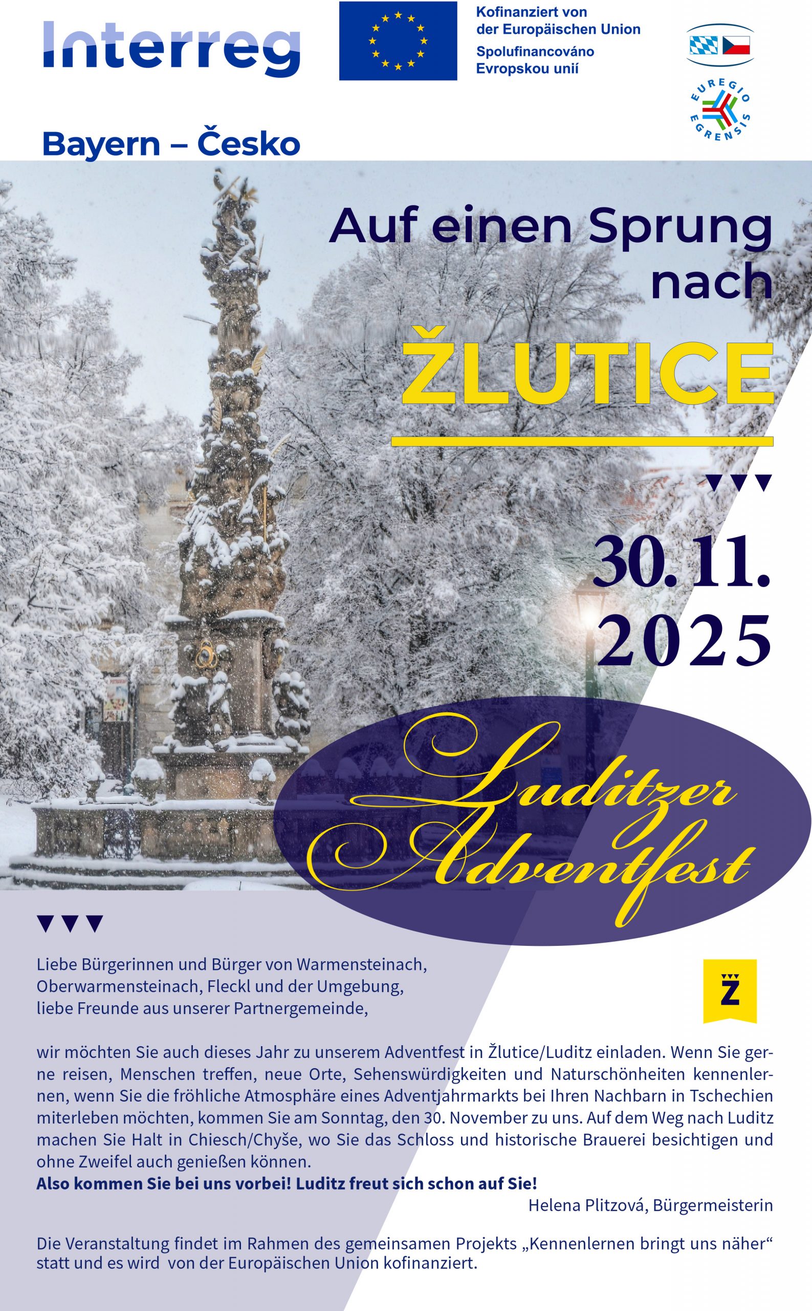 Nachdem am ersten Adventssonntag eine Gruppe Warmensteinacher Bürger zu Musikfesten und Adventsmärkten nach Žlutice kam, wird die malerische Gemeinde im Herzen des Fichtelgebirges am Sonntag, den 8. Dezember, ihre Freunde aus Žlutice willkommen heißen.