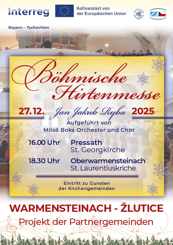 Das Projekt „Kultur verbindet uns“ findet am 28. Dezember 2024 seinen Höhepunkt mit der Aufführung der tschechischen Weihnachtsmesse unter der Leitung des Dirigenten Miloš Bok in den Kirchen in Pressath und Oberwarmensteinach. Die tschechische Weihnachtsmesse von Jakub Jan Ryba, dargeboten von tschechischen Musikern und Sängern, hat in Oberfranken Tradition und bietet seinen Bewohnern ein einzigartiges spirituelles und kulturelles Erlebnis. Und es sind Bürger aus Žlutice, die seit vielen Jahren an der Vermittlung und Interpretation dieses Werkes in Warmensteinach und Umgebung beteiligt sind.