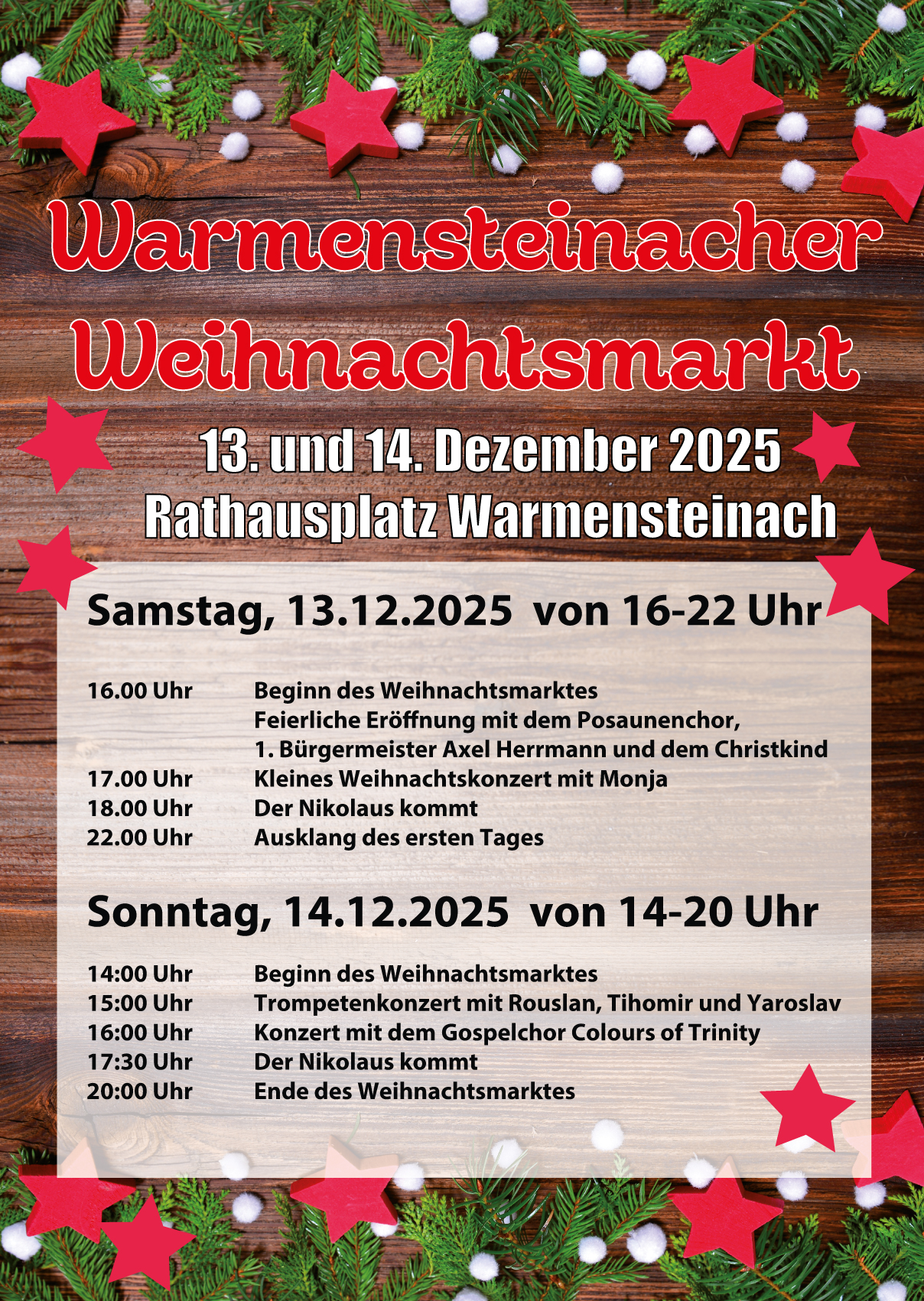 Unser Weihnachtsmarkt in Warmensteinach findet 2025 wieder rund um den Rathausplatz statt: