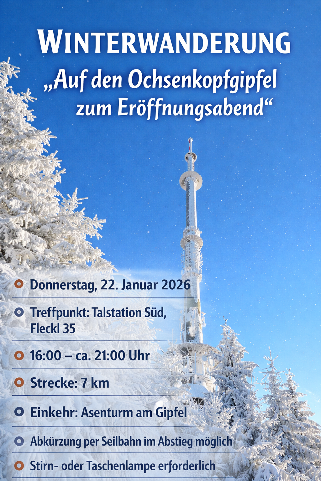 Der gemütliche Hüttenabend auf dem Asenturm am 22. Januar 2026 findet ebenfalls statt. Ab 17:30 Uhr sorgt Livemusik für stimmungsvolle Unterhaltung. Sie können zudem eine besondere Nachtfahrt mit der Ochsenkopf-Seilbahn Nord ab Bischofsgrün auf den Gipfel sowie einen geselligen Abend in gemütlicher Atmosphäre erleben. Wir freuen uns auf Ihr Kommen.